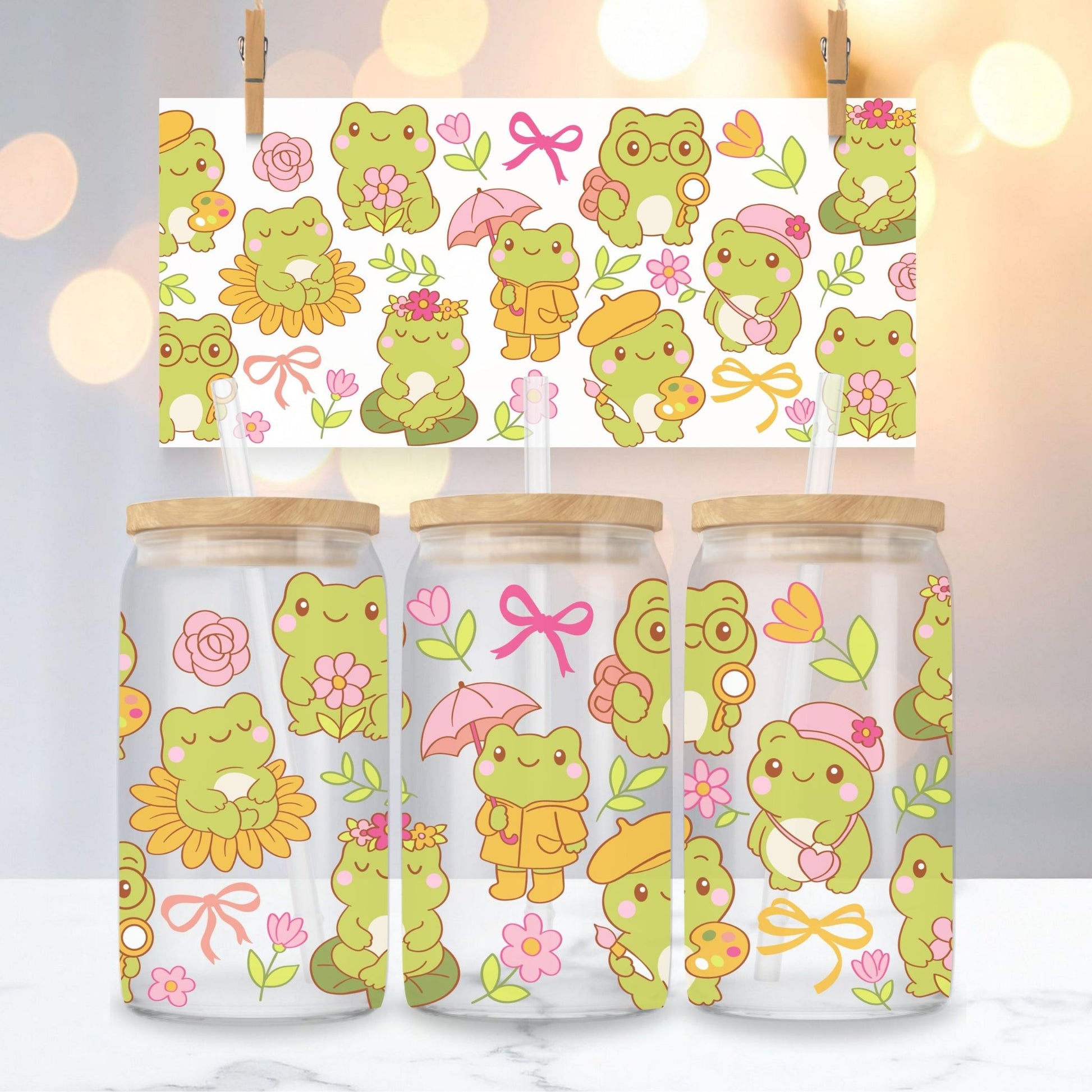 A clear glass cup with adorable pastel frogs and floral details. Perfect for coffee, tea, smoothies, or any refreshing drink that makes your day brighter.
